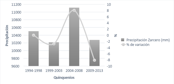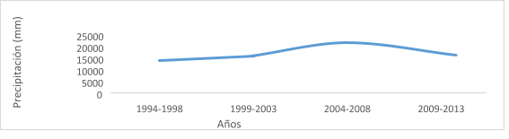 Para el quinquenio de 1994-1998, se mantienen los menores valores de la precipitación. Para el periodo 1999-2003, se registran ligeramente superiores, hasta llegar a tener los datos superiores en el quinquenio de 2004-2008, luego de nuevo se produce un ligero descenso (Figura 3).