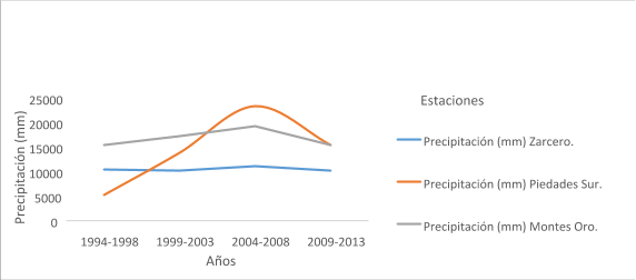 En vista de que son variados los patrones que inducen a la precipitación en el área en estudio, es imperativo hacer un análisis acumulado en periodos de cada cinco años, donde se tiene una estación del sector Subvertiente Norte y dos del sector Pacífico (Tabla I).
