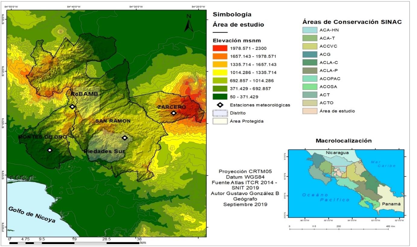 El área de estudio se ubica en parte en el sector cercano a la línea divisoria de aguas y el otro en las faldas de dichos sectores montañosos de Costa Rica (Figura 1). Dichos sectores se convierten asimismo en dos zonas distintas: Una parte presenta una única estación la lluviosa, y otra con dos periodos: el lluvioso y el seco.